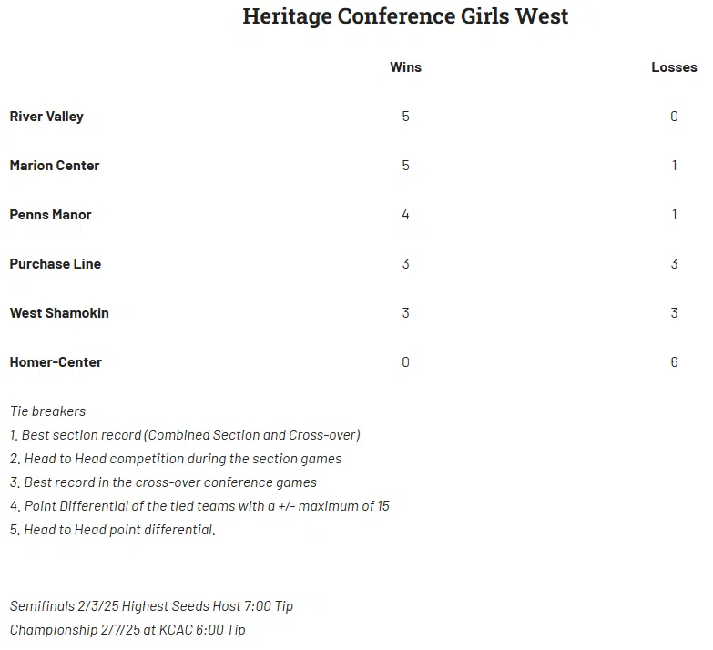 Heritage Conference standings for boys’ and girls’ basketball on January 3, 2025, as provided by the conference.