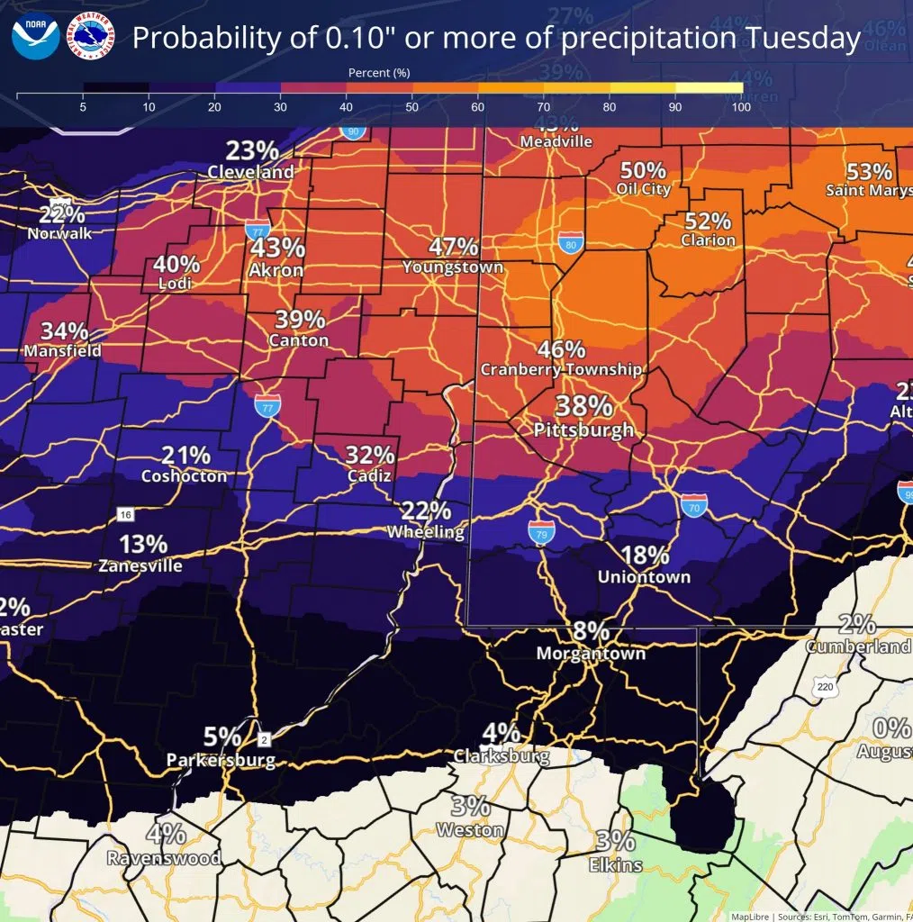 The best chance of 0.10″ or more of total precipitation lies north of Pittsburgh. Snow may mix in north of I-80, but given the light nature and the warming ground, virtually no accumulation is forecast.