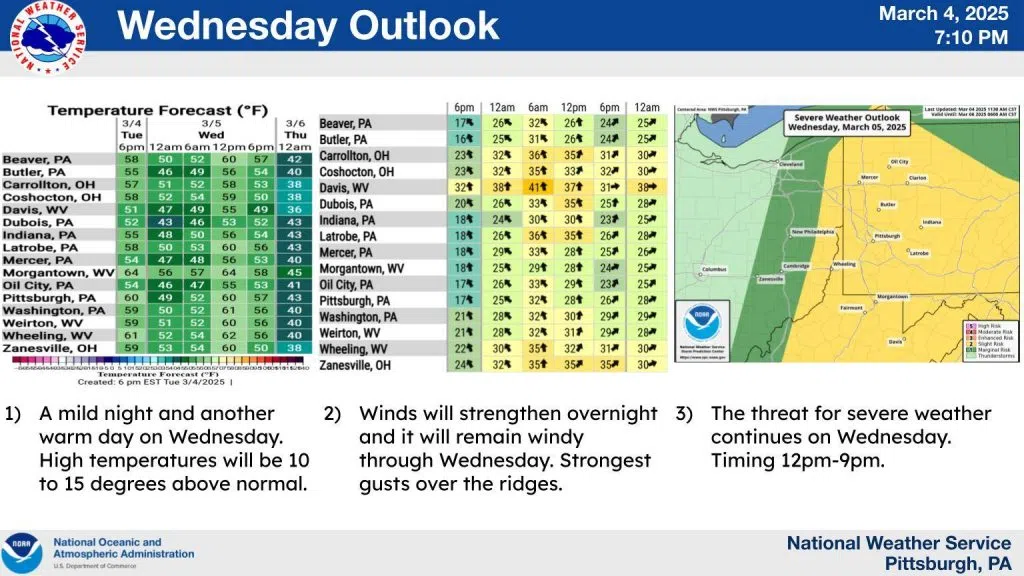 Finally, a strong cold front will barrel through tomorrow evening, bringing much colder temperatures and scattered snow showers Wednesday night. So for timing everything. Stronger wind gusts will begin sometime after 4am first over Ohio and then spread eastward as dawn approaches. Rain will do the same, likely arriving a little bit earlier. The threat for severe weather will increase during the afternoon and continue into the evening. It looks like there is a window of 4 to 5 hours beginning late in the afternoon where the ingredients needed for severe weather will be optimized.