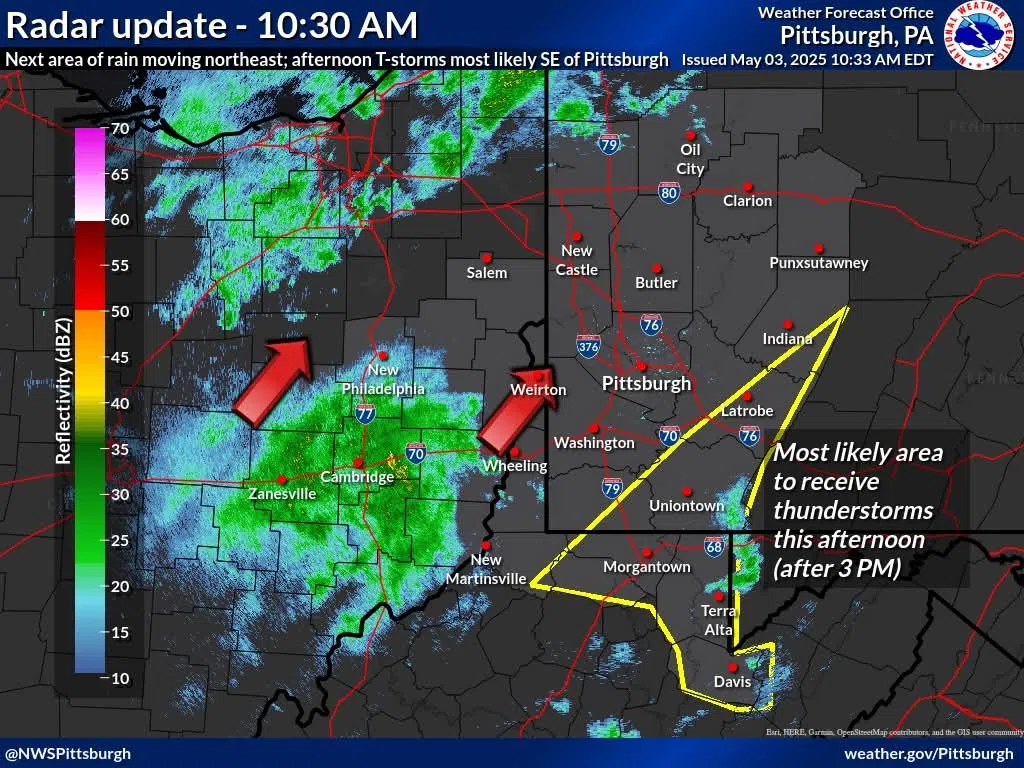 The next area of rain is lifting northeast across eastern Ohio, and will spread over the northern WV panhandle and parts of SW PA over the next few hours. At least scattered showers are likely by early afternoon southeast of Pittsburgh, and this is also where some instability is more likely to develop, making thunderstorms more likely here. Timing of any storms would likely be after 3 PM. A small severe risk remains, with strong to damaging gusts possible in isolated cases.