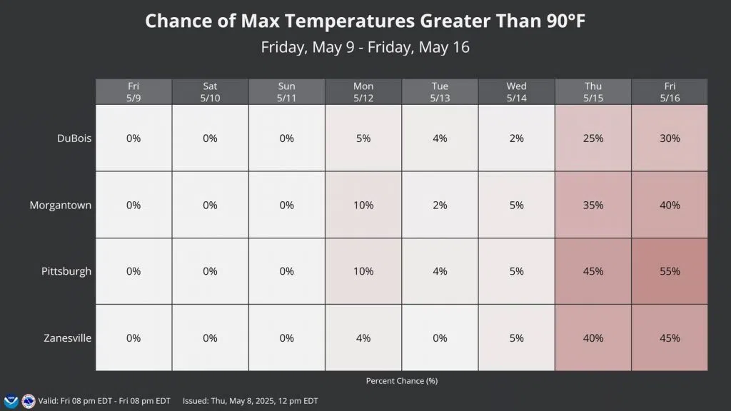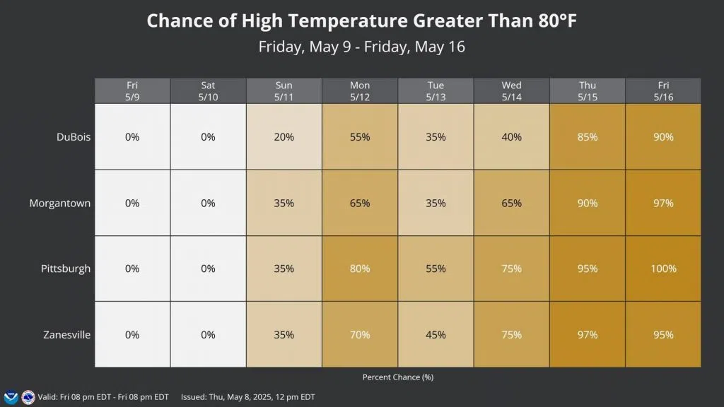 Right now the forecast high for Indiana is 81 degrees for both Monday and Friday.