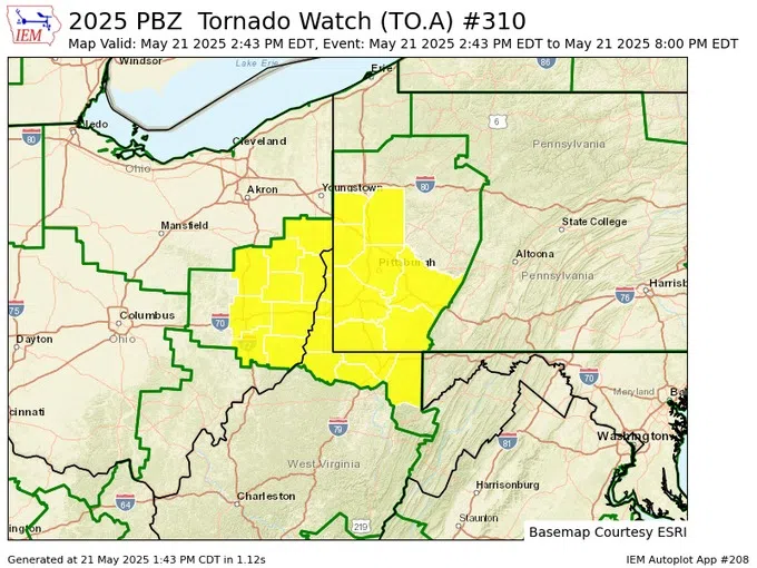 A Tornado Watch has been issued for southeastern OH, northern WV and southwestern PA until 8 PM tonight.