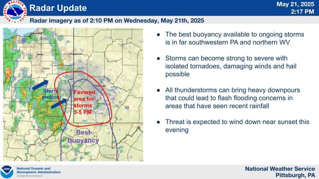 An area of ongoing storms in southeastern OH is moving towards a favored environment (red area on map) and storms could intensify between 3-5 PM. Storms can bring isolated tornadoes, damaging winds, hail and downpours. Remain weather aware and have a way to receive warnings.