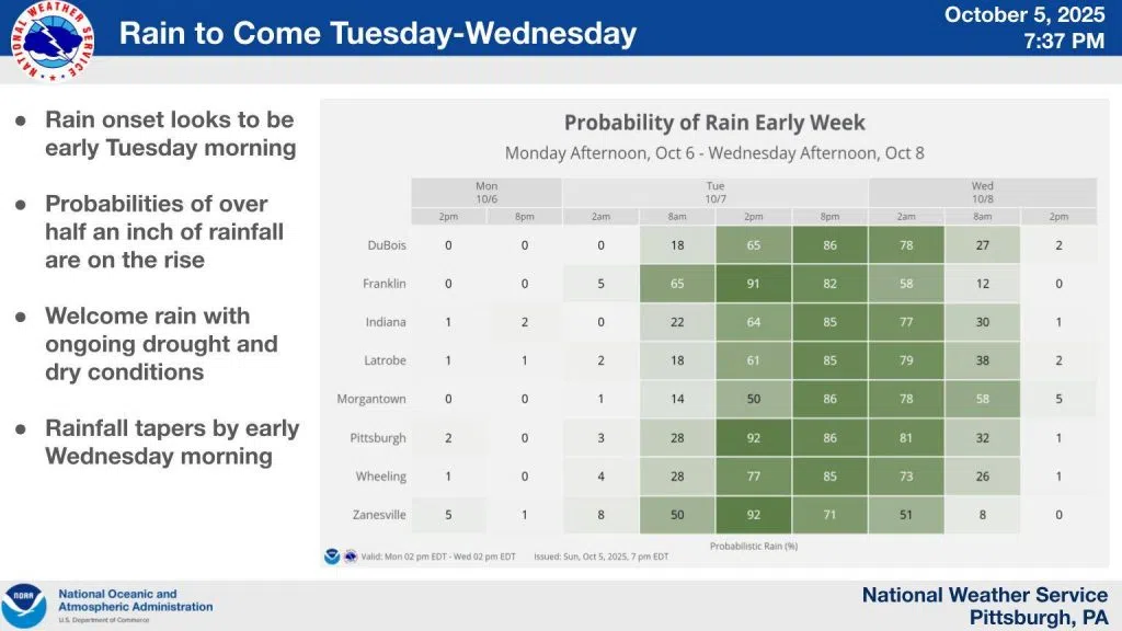 A crossing cold front is expected to bring welcome rainfall across the region Tuesday into Wednesday. Rainfall looks to begin across the region early Tuesday morning. Rainfall is expected to taper by Wednesday morning as cooler, windy and dry conditions grip the area.