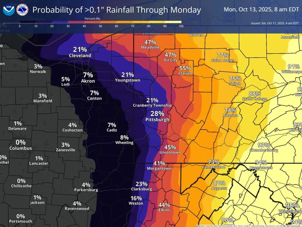 Most rain will stay east of our area (in areas like Indiana County), so there will be a cutoff across our area of those (east) who see a little rain, and those (west) who receive no rain. This map shows the probability of a tenth of an inch or more of rain through Monday. You can see the sharp cutoff from east to west.