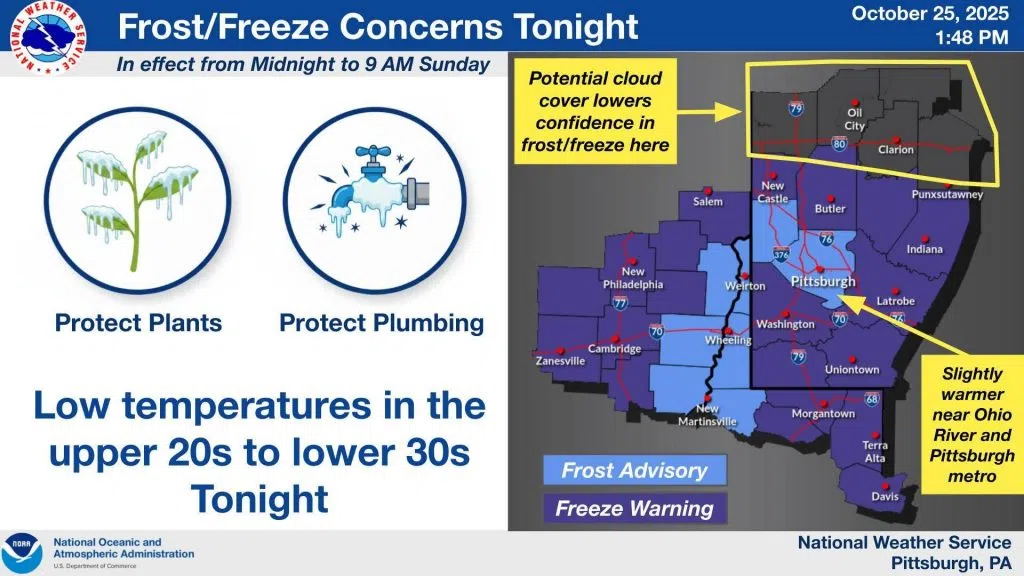 Freeze Warnings and Frost Advisories are in effect tonight for portions of eastern OH, northern WV, and southwestern PA where confidence is highest on temperature dipping near or below 32°F.