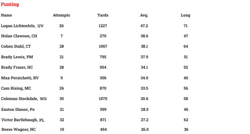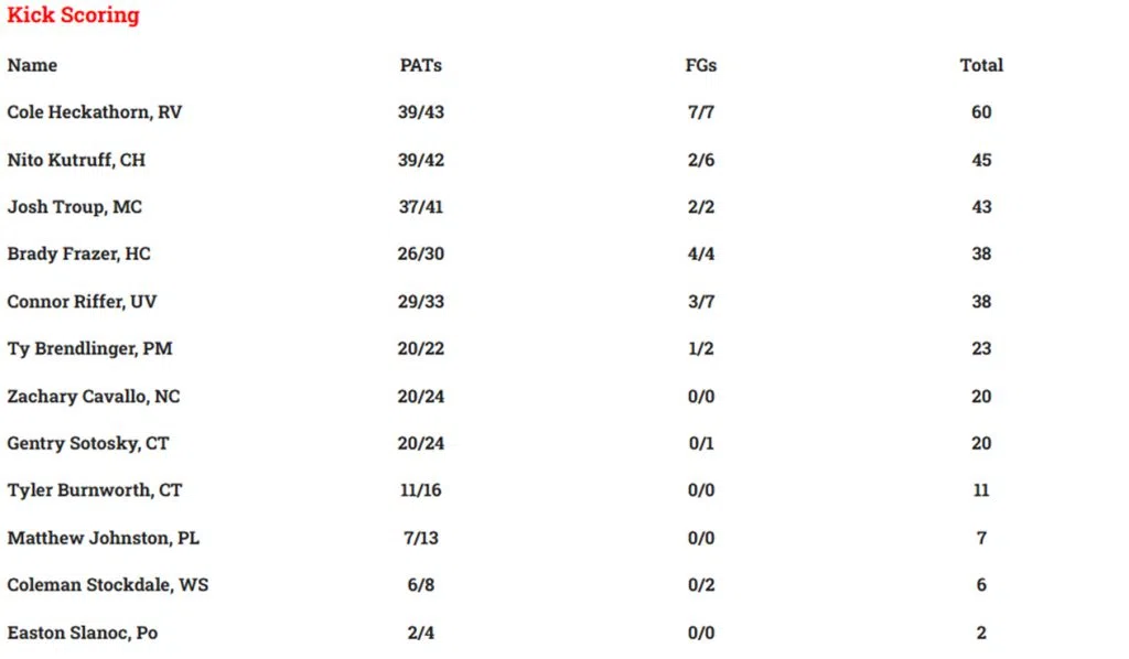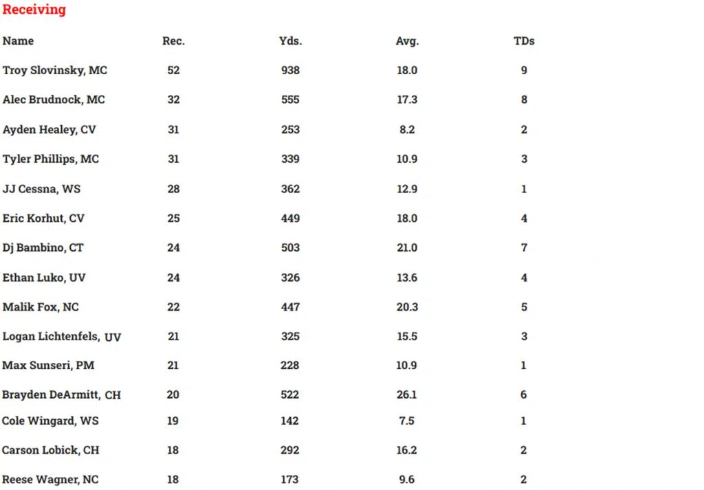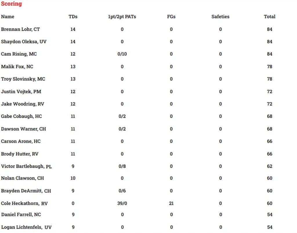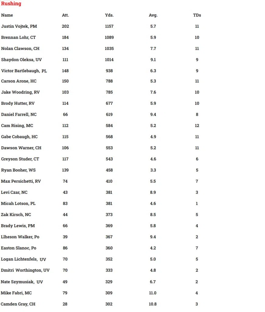 FINAL REGULAR SEASON LOCAL HIGH SCHOOL FOOTBALL STATISTICAL LEADERS