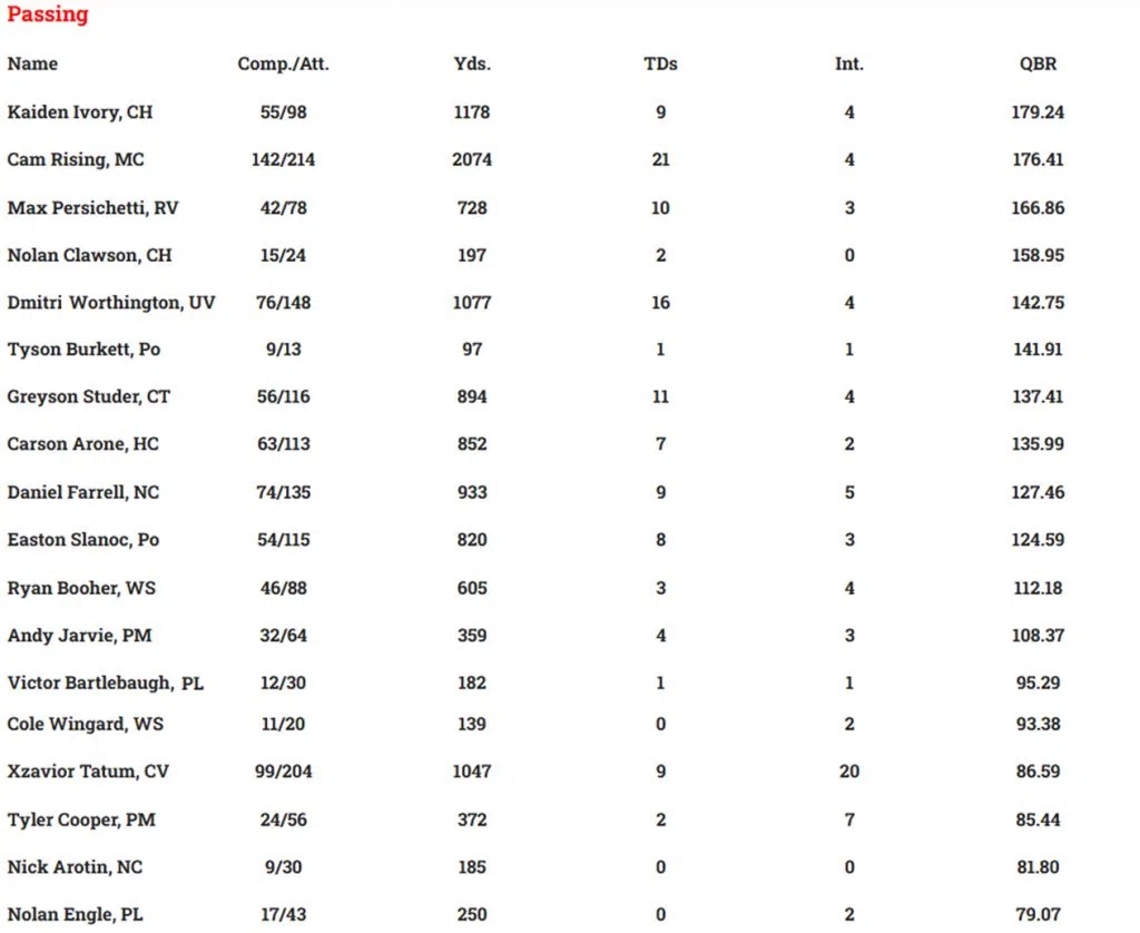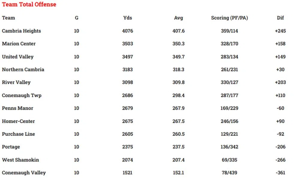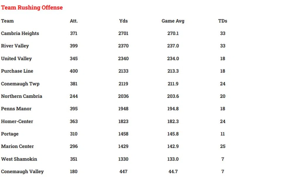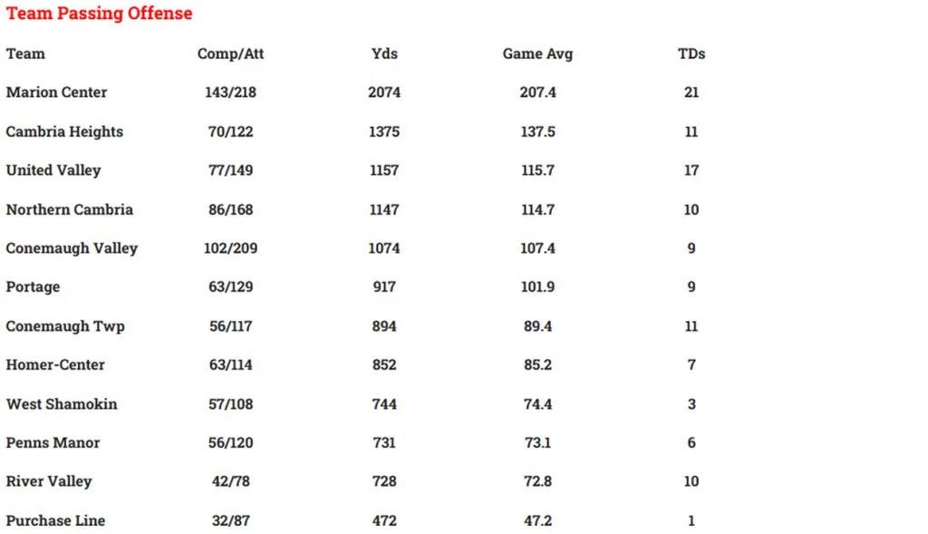 The following are updated local high school football statistics, individual and team offense, through Week 10, as reported by the teams. Quarterback ratings are based on the NCAA formula. Click each section to enlarge.