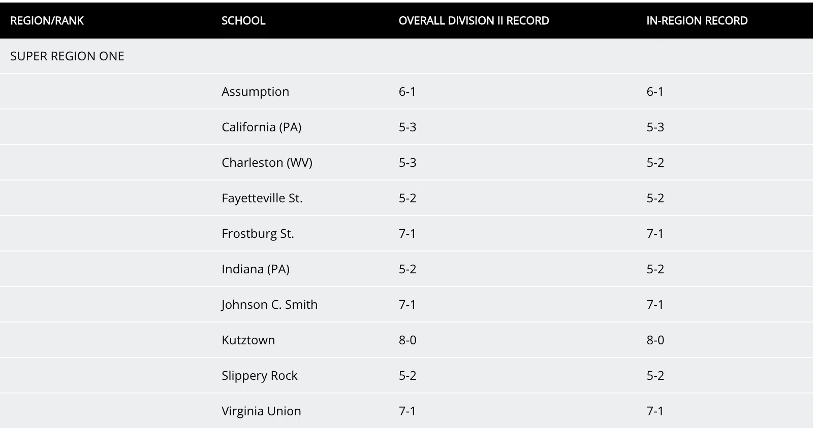 IUP is one of 10 schools in the region to be listed in the rankings. The NCAA does not list them 1 through 10 until later in the year, and the top 8 go to the NCAA Division II playoffs at the conclusion of the regular season.