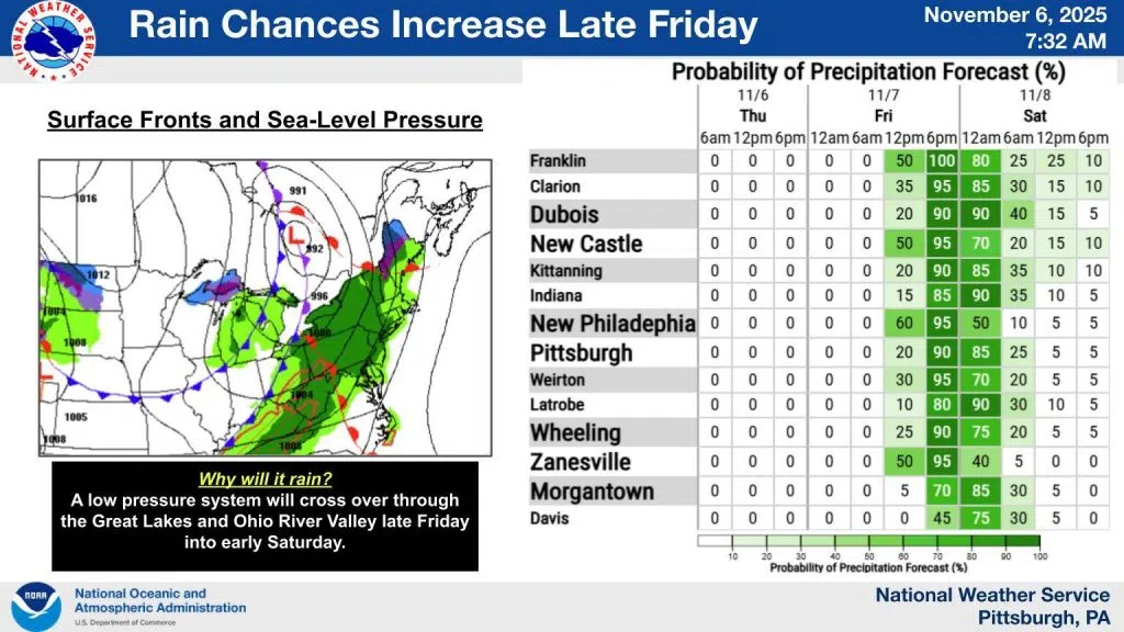 Johnstown (Marion Center vs Bishop McCort Friday at 7 pm) – 75 percent chance of rain at game time. Temperature in the mid-50s.