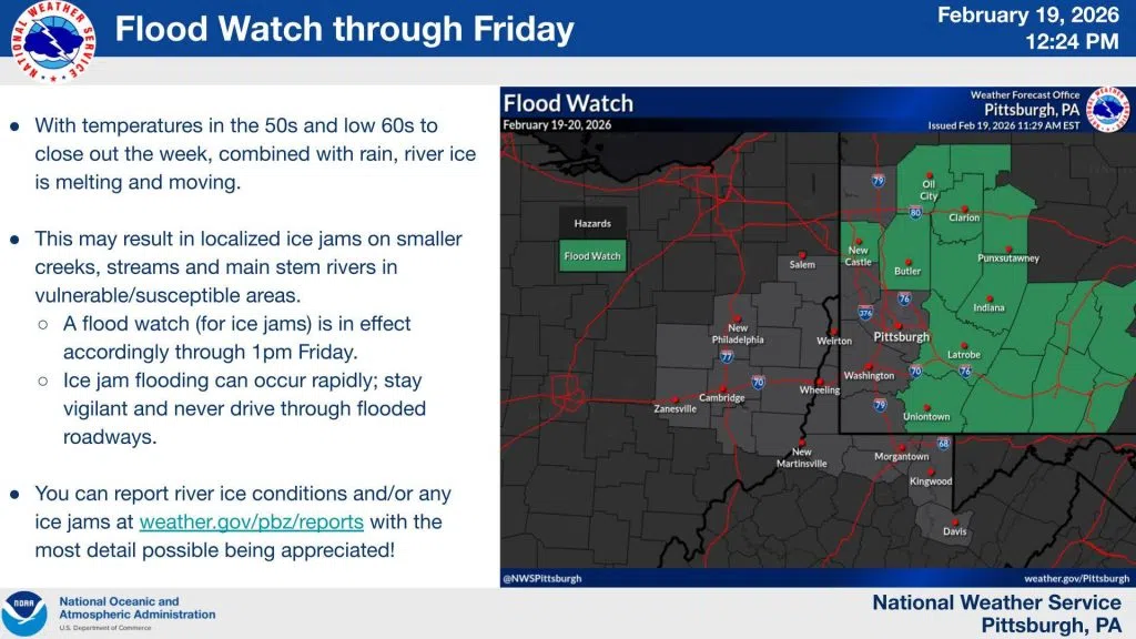 A flood watch is in place starting at 1:00 today and running through 1:00 tomorrow afternoon for Indiana, Westmoreland, Jefferson and Armstrong Counties. Excessive runoff from rain that’s expected later today and tomorrow could result in the flooding of rivers, creeks, streams and other low-lying and flood-prone areas.